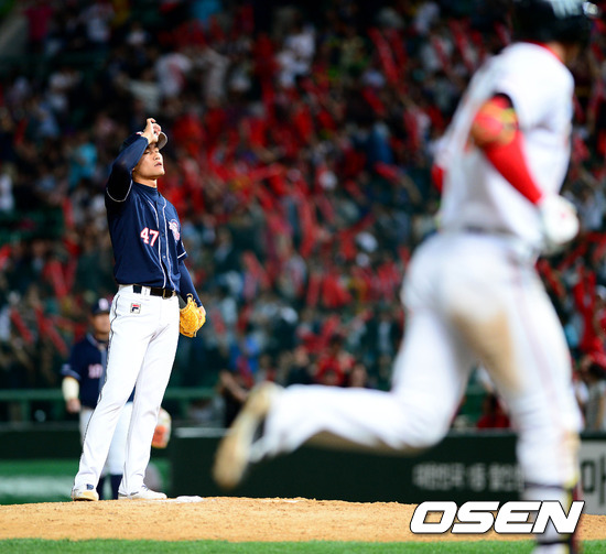 22일 오후 인천 문학구장에서 열린 '2012 팔도 프로야구' SK 와이번스와 두산 베어스의 경기 7회말 박정권에게 솔로포를 내준 홍상삼이 마운드에 서있다.