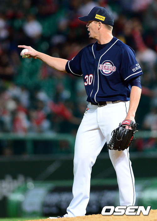 22일 오후 인천 문학구장에서 열린 '2012 팔도 프로야구' SK 와이번스와 두산 베어스의 경기 8회말 무사 1루 타석의 최정을 병살로 잡자 프록터가 동료들에게 격려를 보내고 있다.