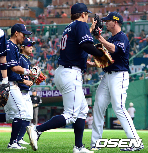 22일 오후 인천 문학구장에서 열린 '2012 팔도 프로야구' SK 와이번스와 두산 베어스의 경기 8회말을 마치고 프록터가 덕아웃으로 향하면서 동료들과 하이파이브를 하고 있다.