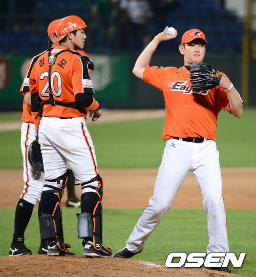 22일 오후 광주 무등야구장에서 열린 '2012 팔도 프로야구' KIA 타이거즈와 한화 이글스의 경기, 7회말 2사 1루 KIA 김원섭 타석때 한화 양훈이 마운드를 내려가고 있다. 양훈은 6⅔이닝 1실점을 기록했다.