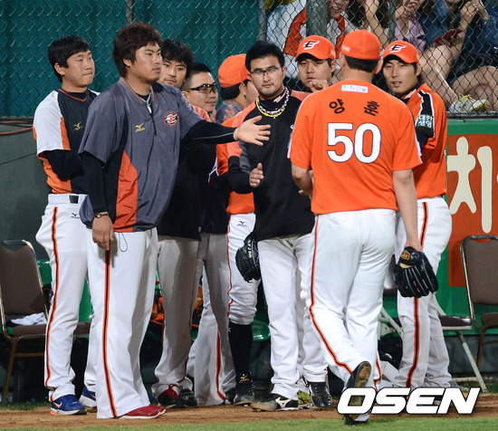 22일 오후 광주 무등야구장에서 열린 '2012 팔도 프로야구' KIA 타이거즈와 한화 이글스의 경기, 7회말 2사 1루 KIA 김원섭 타석때 한화 양훈이 마운드를 내려가며 동료들과 하이파이브를 하고 있다.
