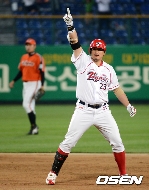 22일 오후 광주 무등야구장에서 열린 '2012 팔도 프로야구' KIA 타이거즈와 한화 이글스의 경기, 8회말 무사 1,2루 KIA 최희섭이 동점 2타점 적시타를 치고 환호하고 있다.
