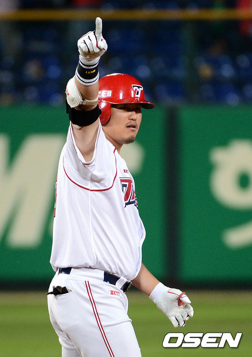 22일 오후 광주 무등야구장에서 열린 '2012 팔도 프로야구' KIA 타이거즈와 한화 이글스의 경기, 8회말 무사 1,2루 KIA 최희섭이 동점 2타점 적시타를 치고 환호하고 있다.