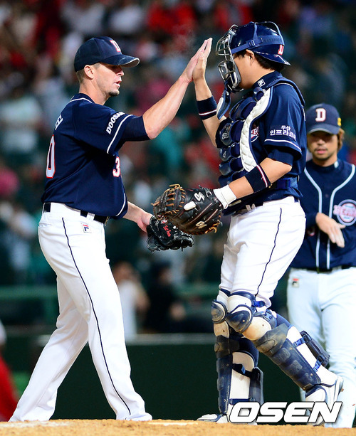 22일 오후 인천 문학구장에서 열린 '2012 팔도 프로야구' SK 와이번스와 두산 베어스의 경기 종료후 프록터와 양의지가 승리를 기뻐하며 하이파이브를 하고 있다.