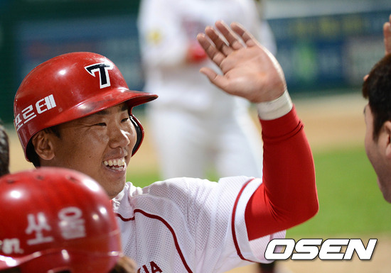 22일 오후 광주 무등야구장에서 열린 '2012 팔도 프로야구' KIA 타이거즈와 한화 이글스의 경기, 8회말 무사 1,2루 KIA 최희섭의 동점 2타점 적시타때 홈을 밟은 2루주자 이범호가 더그아웃에서 환하게 웃고 있다.