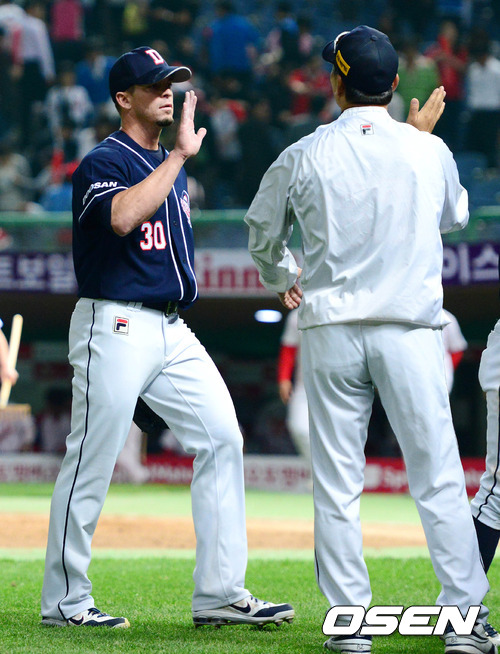 22일 오후 인천 문학구장에서 열린 '2012 팔도 프로야구' SK 와이번스와 두산 베어스의 경기 종료후 프록터와 김진욱 감독이 하이파이브를 하고 있다.