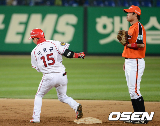 22일 오후 광주 무등야구장에서 열린 '2012 팔도 프로야구' KIA 타이거즈와 한화 이글스의 경기, 8회말 2사 1,3루 KIA 이용규가 역전 1타점 적시타를 치고 환호하고 있다.