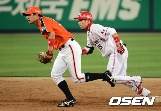 22일 오후 광주 무등야구장에서 열린 '2012 팔도 프로야구' KIA 타이거즈와 한화 이글스의 경기, 8회말 2사 1,3루 KIA 이용규가 역전 1타점 적시 2루타를 치고 홈으로 송구된 틈을 타 3루로 달리고 있다.
