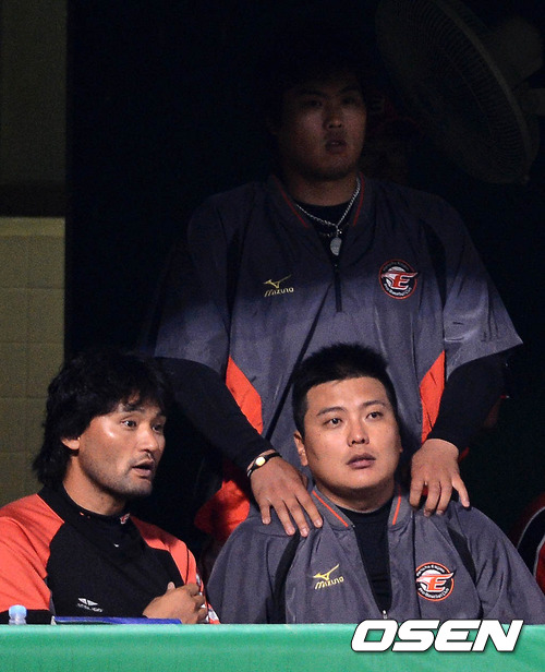 22일 오후 광주 무등야구장에서 열린 '2012 팔도 프로야구' KIA 타이거즈와 한화 이글스의 경기, 9회초 2사 만루 한화 오선진 타석때 박찬호, 류현진, 김태균이 더그아웃에서 경기를 지켜보고 있다.