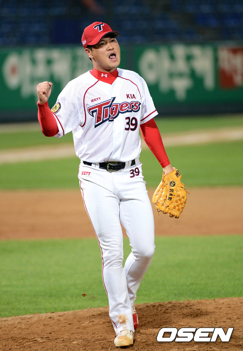 9회초 2사 만루 KIA 유동훈이 한화 오선진을 삼진으로 처리하고 환호하고 있다. / sunday@osen.co.kr