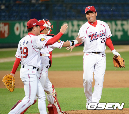 경기 종료 후 KIA 포수 김상훈과 유동훈이 이범호와 승리의 기쁨을 나누고 있다. / sunday@osen.co.kr