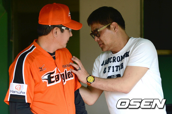 23일 오후 광주 무등야구장에서 열린 '2012 팔도 프로야구' KIA 타이거즈와 한화 이글스의 경기에 앞서 한화 한대화 감독이 KBS N 이병훈 해설위원과 이야기를 나누고 있다. 이 위원은 지난 21일 서울 관악구 낙성대동에 있는 놀이터에서 성추행범을 붙잡아 경찰에 넘긴 사실이 알려지며 화제가 됐다.