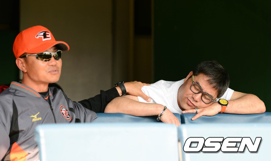23일 오후 광주 무등야구장에서 열린 '2012 팔도 프로야구' KIA 타이거즈와 한화 이글스의 경기에 앞서 한화 김준기 전력분석이 KBS N 이병훈 해설위원이 어깨를 주물러 주고 있다. 이 위원은 지난 21일 서울 관악구 낙성대동에 있는 놀이터에서 성추행범을 붙잡아 경찰에 넘긴 사실이 알려지며 화제가 됐다.