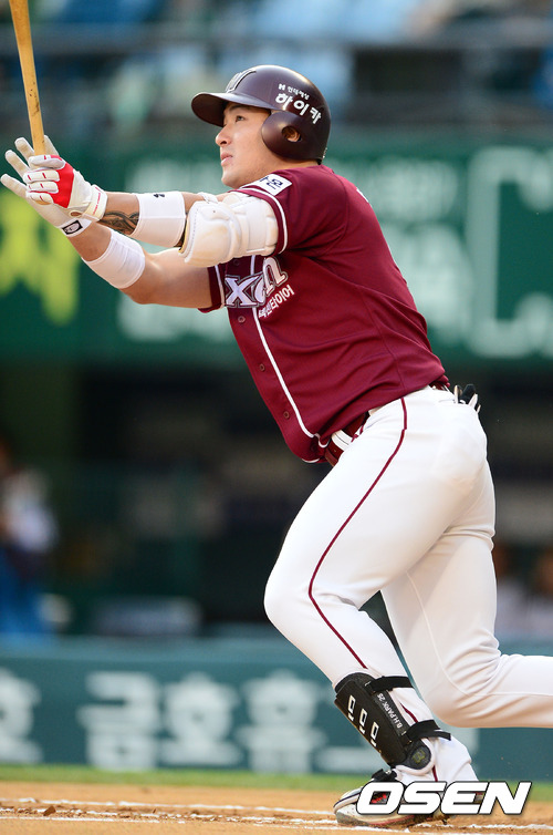 23일 오후 서울 잠실구장에서 열린 '2012 팔도 프로야구' LG 트윈스와 넥센 히어로즈의 경기, 1회초 1사 1,3루에서 넥센 박병호가 선제 1타점 적시 2루타를 날리고 타구를 바라보고 있다.