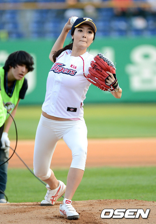 23일 오후 광주 무등야구장에서 열린 '2012 팔도 프로야구' KIA 타이거즈와 한화 이글스의 경기에 앞서 방송인 이수정이 시구를 하고 있다.