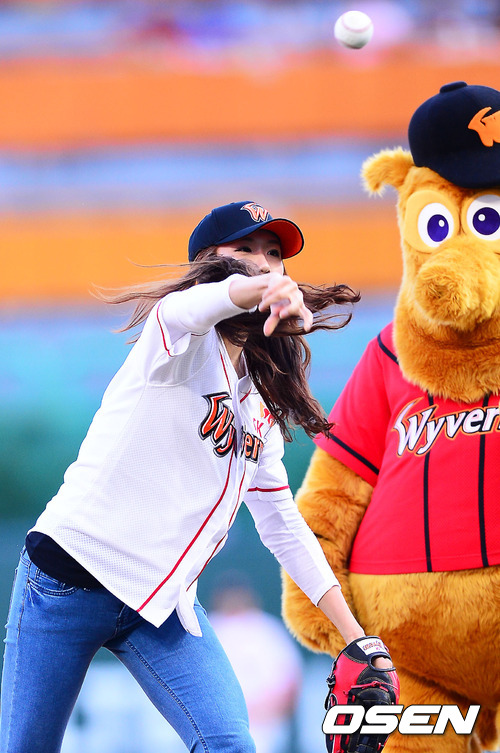23일 오후 인천 문학구장에서 열린 '2012 팔도 프로야구' SK 와이번스와 두산 베어스의 경기에서 흥국생명 핑크스파이더스 김혜진 배구선수가 시구를 하고 있다.
