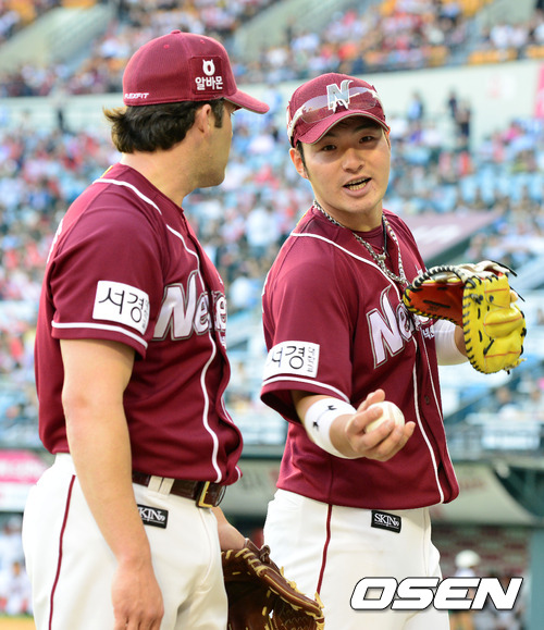 23일 오후 서울 잠실구장에서 열린 '2012 팔도 프로야구' LG 트윈스와 넥센 히어로즈의 경기, 1회말 수비를 마치고 넥센 나이트와 박병호가 이야기를 나누며 더그아웃으로 향하고 있다.