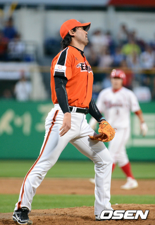 23일 오후 광주 무등야구장에서 열린 '2012 팔도 프로야구' KIA 타이거즈와 한화 이글스의 경기, 3회말 2사 만루 한화 박찬호가 KIA 이범호에게 몸에맞는볼을 허용하고 아쉬워하고 있다.