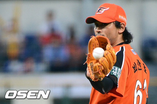 23일 오후 광주 무등야구장에서 열린 '2012 팔도 프로야구' KIA 타이거즈와 한화 이글스의 경기, 3회말 2사 만루 한화 박찬호가 포수 정범모에게 공을 받고 있다.