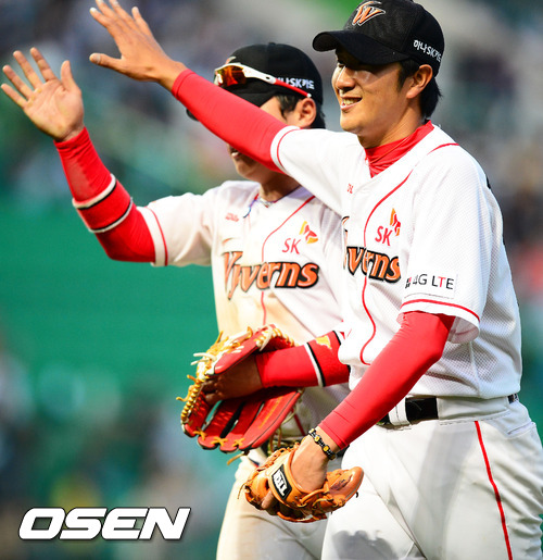 23일 오후 인천 문학구장에서 열린 '2012 팔도 프로야구' SK 와이번스와 두산 베어스의 경기에서 4회초를 마친 SK 선발 제춘모가 동료들과 하이파이브를 하고 있다.
