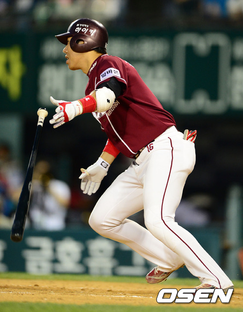 23일 오후 서울 잠실구장에서 열린 '2012 팔도 프로야구' LG 트윈스와 넥센 히어로즈의 경기, 4회초 2사 2루에서 넥센 강정호가 1타점 적시타를 날리고 있다.