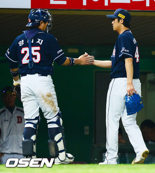 23일 오후 인천 문학구장에서 열린 '2012 팔도 프로야구' SK 와이번스와 두산 베어스의 경기에서 5회말을 마무리 한 두산 이용찬이 덕아웃 앞에서 양의지와 하이파이브를 하고 있다.