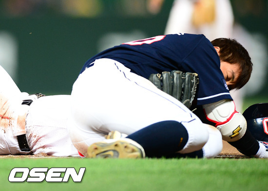 23일 오후 인천 문학구장에서 열린 '2012 팔도 프로야구' SK 와이번스와 두산 베어스의 경기에서 6회초 첫타석에서 두산 김현수가 1루수 왼쪽 내야 안타를 날린 후 1루로 달려 1루에서 공을 받기 위해 기다리고 있던 SK 엄정욱 투수와 충돌하며 넘어지고 있다.