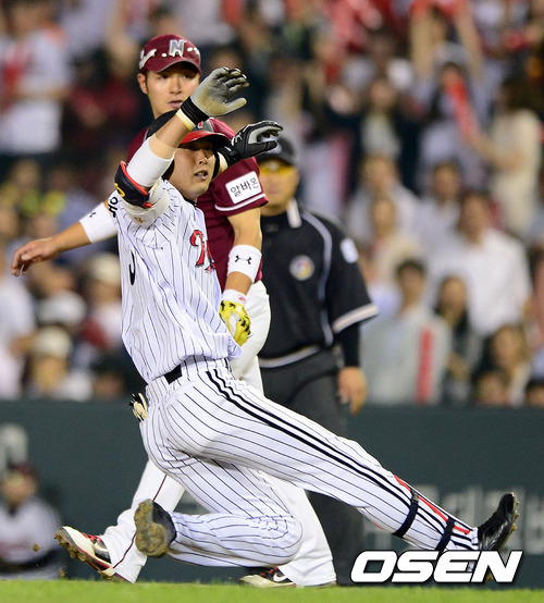 23일 오후 서울 잠실구장에서 열린 '2012 팔도 프로야구' LG 트윈스와 넥센 히어로즈의 경기, 4회말 1사 1,2루에서 LG 서동욱이 펜스에 맞는 장타를 날리고도 주자들이 2,3루에 멈추는 바람에 1루로 귀루하고 있다.