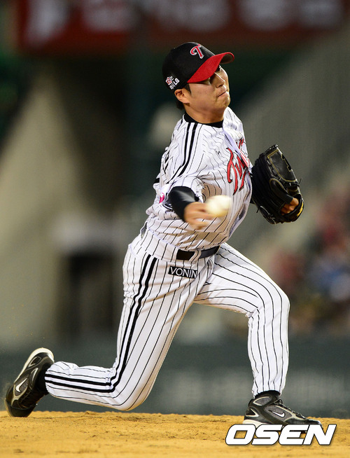 23일 오후 서울 잠실구장에서 열린 '2012 팔도 프로야구' LG 트윈스와 넥센 히어로즈의 경기, 4회초 2사 1루에서 마운드에 오른 LG 우규민이 역투하고 있다.