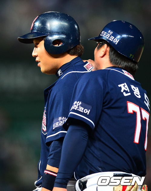 23일 오후 인천 문학구장에서 열린 '2012 팔도 프로야구' SK 와이번스와 두산 베어스의 경기에서 6회초 무사 주자 2,3루 두산 양의지가 좌익수 앞 1타점 적시타를 날린 후 1루에서 전형도 코치와 기쁨을 나누고 있다.