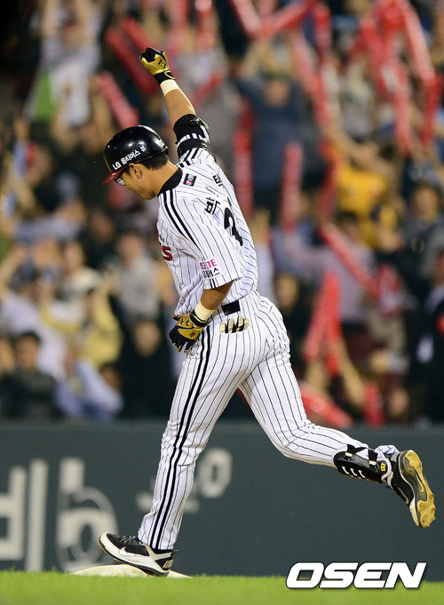 23일 오후 서울 잠실구장에서 열린 '2012 팔도 프로야구' LG 트윈스와 넥센 히어로즈의 경기, 5회말 무사 2루에서 LG 박용택이 투런포를 날리고 손을 들며 기뻐하고 있다.