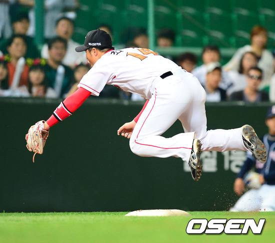 23일 오후 인천 문학구장에서 열린 '2012 팔도 프로야구' SK 와이번스와 두산 베어스의 경기에서 6회초 1사 주자 2루 두산 손시헌의 파울 타구를 잡기 위해 SK 3루수 최정이 몸을 날리고 있다.