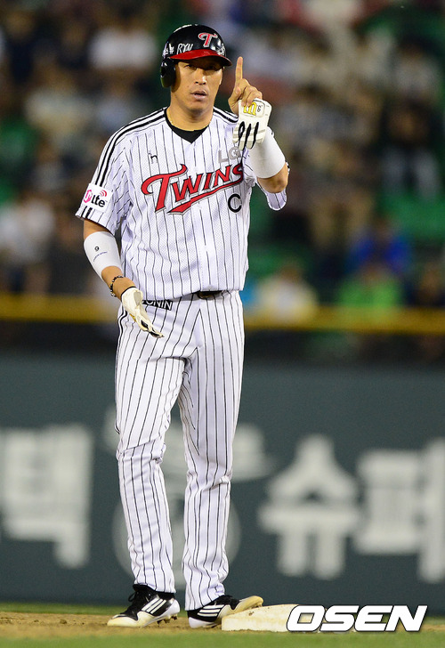 23일 오후 서울 잠실구장에서 열린 '2012 팔도 프로야구' LG 트윈스와 넥센 히어로즈의 경기, 5회말 1사 2루에서 LG 이병규가 동점 적시 2루타를 날리고 기뻐하고 있다.