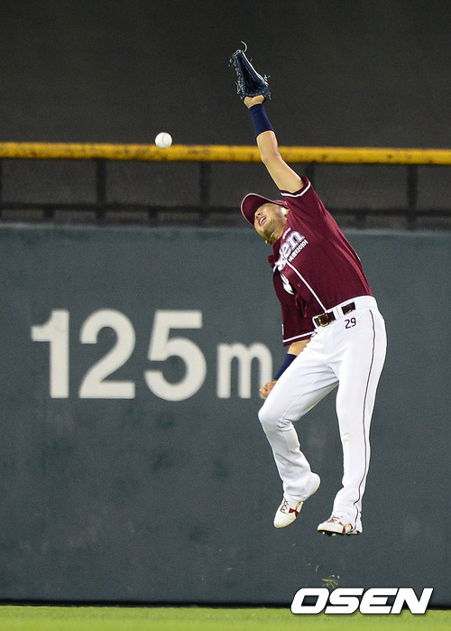 23일 오후 서울 잠실구장에서 열린 '2012 팔도 프로야구' LG 트윈스와 넥센 히어로즈의 경기, 5회말 1사 2루에서 넥센 이택근이 LG 이병규의 타구에 점프했지만 잡지 못하고 있다. 이병규는 동점 적시 2루타.