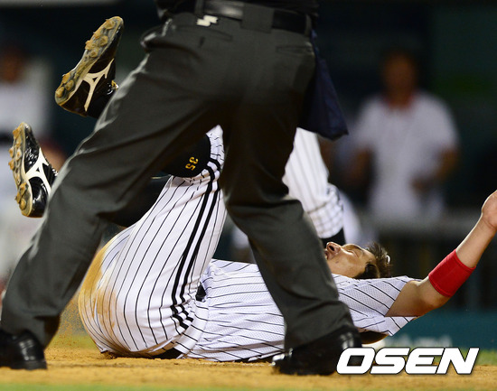 23일 오후 서울 잠실구장에서 열린 '2012 팔도 프로야구' LG 트윈스와 넥센 히어로즈의 경기, 5회말 1사 2루에서 LG 이진영이 이병규의 동점 적시 2루타에 홈에서 슬라이딩하며 세이프되고 있다.