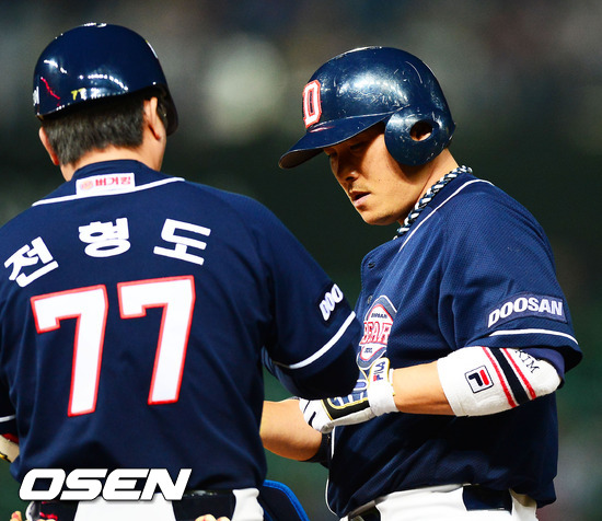 23일 오후 인천 문학구장에서 열린 '2012 팔도 프로야구' SK 와이번스와 두산 베어스의 경기에서 6회초 무사 주자 1루 두산 김동주가 우익수 오른쪽 1루타를 날린 후 1루에서 전형도 코치와 하이파이브를 하고 있다.