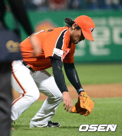 23일 오후 광주 무등야구장에서 열린 '2012 팔도 프로야구' KIA 타이거즈와 한화 이글스의 경기, 7회말 무사 1,2루 한화 박찬호가 KIA 이용규의 번트 타구를 놓치고 있다.