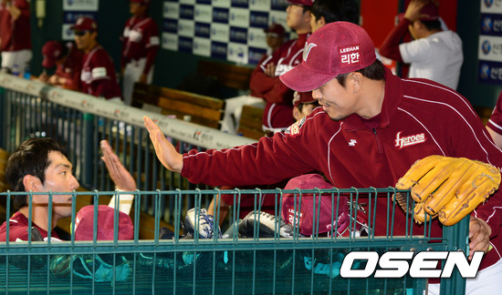 23일 오후 서울 잠실구장에서 열린 '2012 팔도 프로야구' LG 트윈스와 넥센 히어로즈의 경기, 6회초 1사 만루에서 넥센 유한준의 2타점 적시타에 홈을 밟은 서건창이 더그아웃에서 김병현과 하이파이브를 하고 있다.