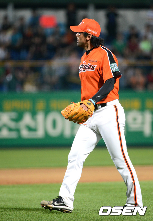 23일 오후 광주 무등야구장에서 열린 '2012 팔도 프로야구' KIA 타이거즈와 한화 이글스의 경기, 7회말 무사 만루 KIA 김원섭 타석때 한화 박찬호가 마운드를 내려가고 있다.