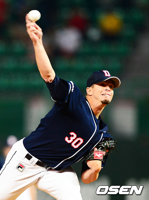 9회말 두산 프록터가 힘차게 공을 뿌리고 있다. / rumi@osen.co.kr