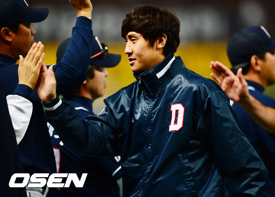 경기를 마치고 두산 이용찬이 코치들과 하이파이브를 하고 있다. / rumi@osen.co.kr