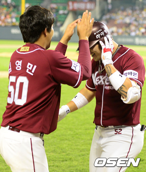 23일 오후 서울 잠실구장에서 열린 '2012 팔도 프로야구' LG 트윈스와 넥센 히어로즈의 경기, 8회초 무사에서 넥센 박병호가 솔로포를 날리고 더그아웃에서 동료선수들과 하이파이브를 하고 있다.