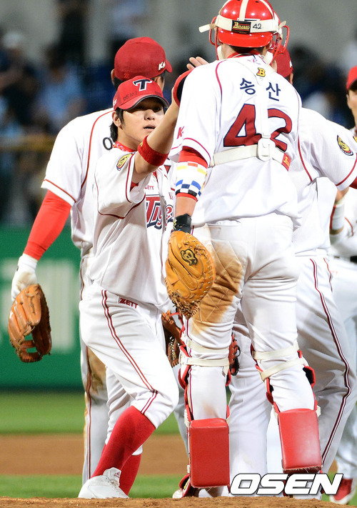 경기 종료 후 KIA 김선빈과 송산이 승리의 기쁨을 나누고 있다. / sunday@osen.co.kr