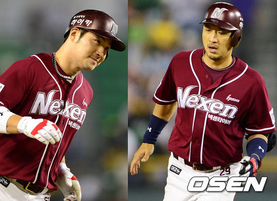 23일 오후 서울 잠실구장에서 열린 '2012 팔도 프로야구' LG 트윈스와 넥센 히어로즈의 경기, 8회초 무사에서 넥센 이택근과 박병호가 백투백 홈런을 날리고 그라운드를 돌고 있다.