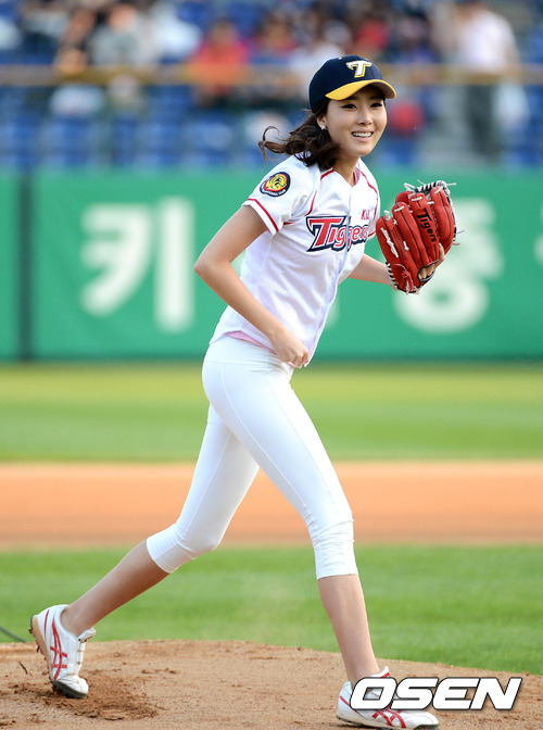 경기에 앞서 방송인 이수정이 시구를 하고 있다. / sunday@osen.co.kr