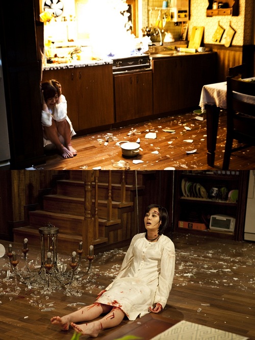 극중 동생 정미(강별 분)를 구해내기 위해 언니 세희(박보영 분)가 고군분투하는 주택 장면은 영화의 하이라이트라 해도 과언이 아니었기에 보이지 않는 정체의 두려움을 극대화하고자 했다. 이에 가스레인지에 스스로 불이 붙거나, 수 없이 많은 유리 접시들이 튕겨져 나오고 천장의 샹들리에가 떨어지는 등이 동원된 공포 영화에서 쉽게 볼 수 없는 고난이도 세트 폭발신이 진행됐다.
