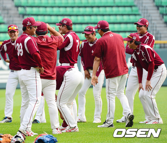 24일 오후 서울 잠실구장에서 '2012 팔도 프로야구' LG 트윈스와 넥센 히어로즈와의 경기가 열릴 예정인 가운데 넥센 미팅시간에 분위기가 화기애애하다.