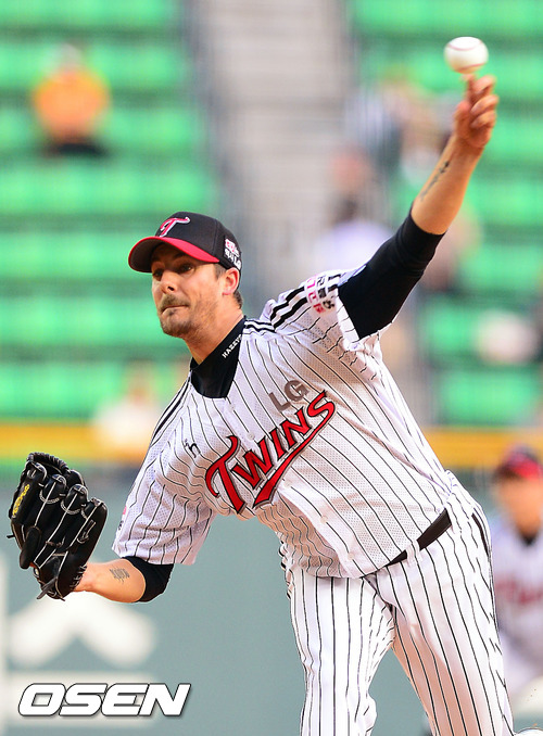 24일 오후 서울 잠실구장에서 열린 '2012 팔도 프로야구' LG 트윈스와 넥센 히어로즈와의 경기에서 LG 선발 주키치가 힘차게 공을 뿌리고 있다.
