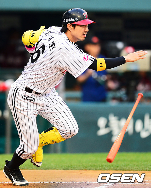 24일 오후 서울 잠실구장에서 열린 '2012 팔도 프로야구' LG 트윈스와 넥센 히어로즈와의 경기에서 1회말 무사 주자 1,3루 LG 정성훈이 우익수 앞 1타점 적시타를 날리고 있다.