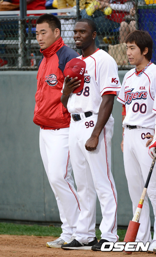 24일 오후 광주 무등야구장에서 열린 '2012 팔도 프로야구' KIA 타이거즈와 한화 이글스의 경기에 앞서 KIA 새로운 외국인 투수 헨리 소사(27)가 국민의례를 갖고 있다.